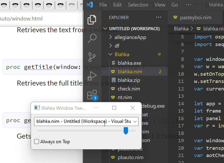 I got sick of using random tools to control the "always on top" flag of a window on windows, so I made my own tool. As an added bonus it can also control the transparency of a window using a slider.